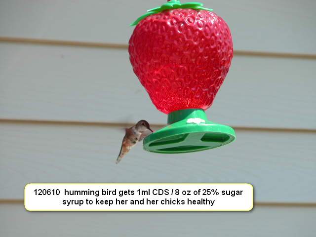 I also dose my Humming birds - 1 ml 6000ppm CDS / 3 cups 30% sugar syrup - I haven't had a single complaint