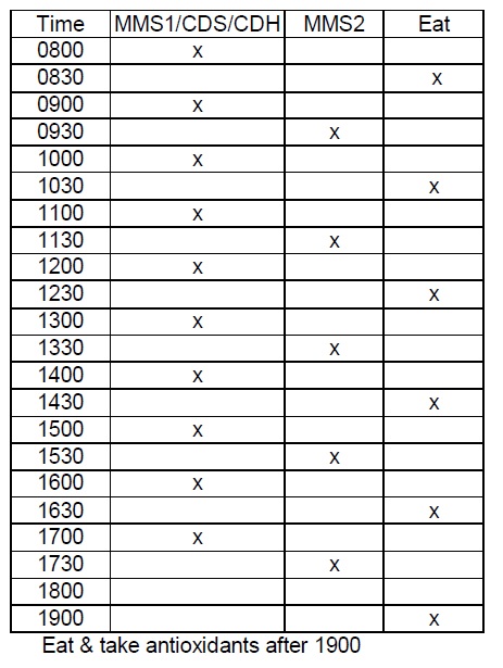 I can't really tell you so much about the quantity of MMS2 to take other than I know you are supposed to start very slowly and gradually build up the amount of MMS2 you take per dose. Like they say a grain to start in a capsule. As far as a schedule, Charlotte made up this dosing schedule: