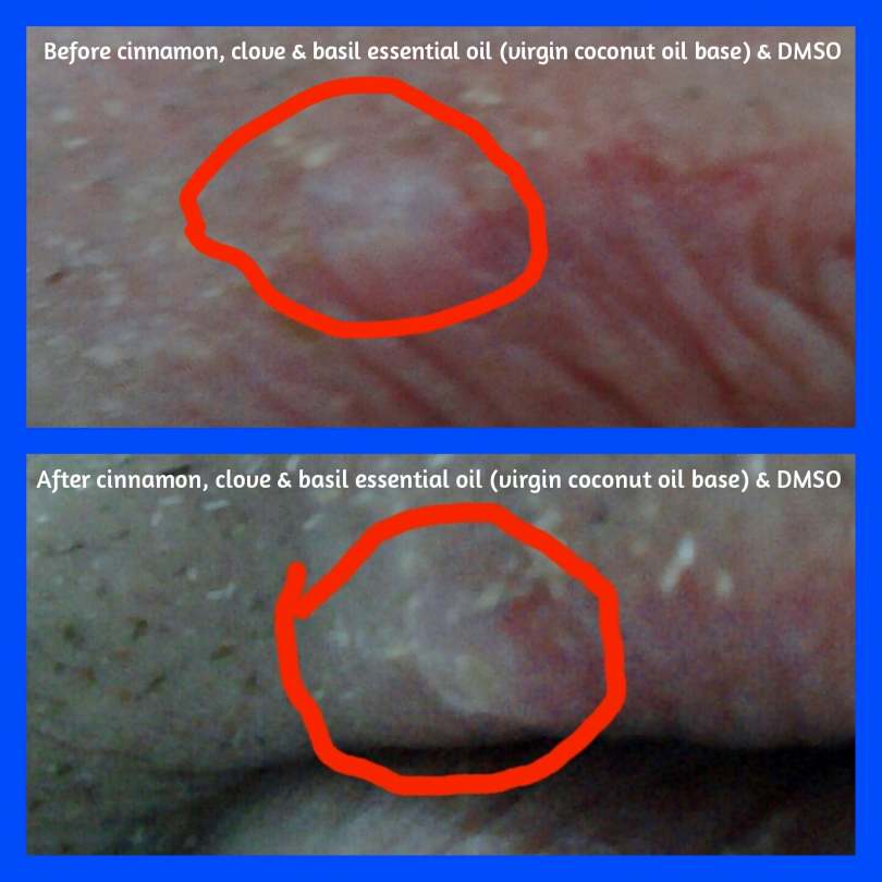 I have had some kind of "herpes" looking blister on my upper lip for about 6 months now and have tried various ways of making it go away. The other day I made up a batch of about 4 drops cinnamon bark essential oil, 4 drops clove oil and 8 drops basil oil mixed into about 90 drops of virgin coconut oil and applied it to my bump. Not much happened so then I tried applying it (and when I say applying it I mean I'm only putting about 1/4 drop of this oil mix on the blister because if I put more it would drip into my mouth) and then immediately put about 1/4 drop of 50% DMSO on top of it. That did it! By the next morning the blister thing was starting to dry up and it's day by day beginning to fade. I don't know what it is exactly and there isn't any pain associated with it, but I guess it looks like a herpes blister. It kind of moved from the upper part of my lip to where it is now nearer to the corner of my mouth over the 6 months.