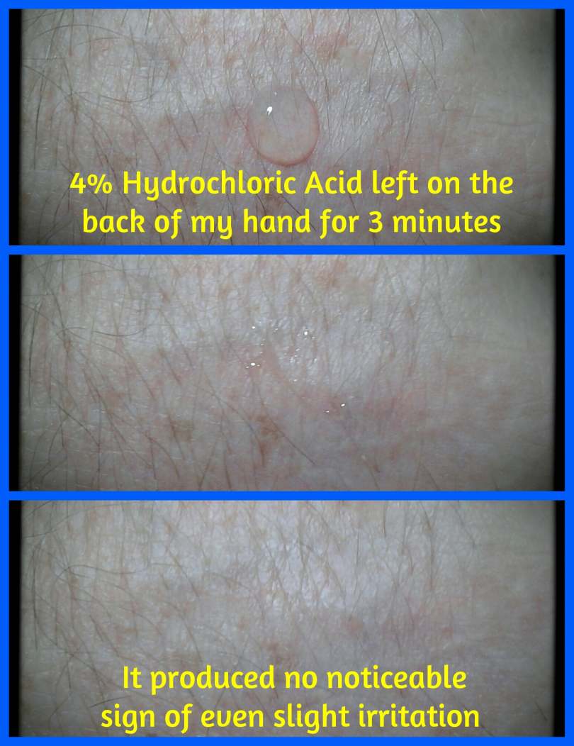 Just wanted to share a little test I did to prove to myself how mild 4% HCl really is. I put a drop on the back of my hand and let it sit there for 3 minutes to see if it would cause any irritation and I'm happy to say that it appears to be extremely mild and didn't do a thing to my skin.