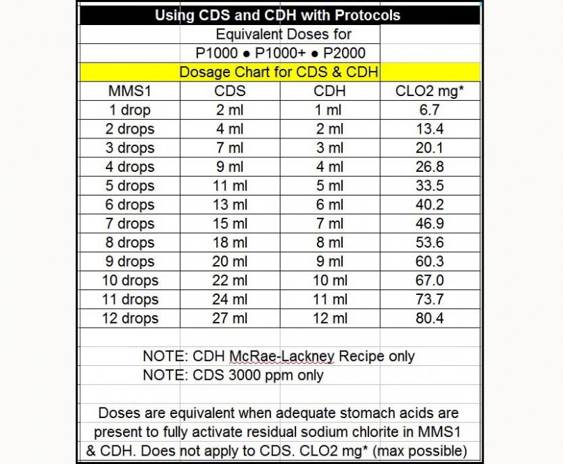 1 ml of the original CDH recipe (McRae-Lackney) (not Mark's) ingested, would be the same as a 1 drop MMS1 dose. If you want to take a 2 drop equivalent dose, that would be 2 ml of CDH, etc.