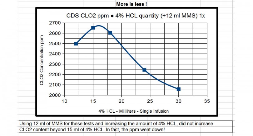 When I was testing using 4% HCL trying to make 3000 ppm CDS, I tried different amounts of 4% HCL, while keeping the same amount of MMS, and found this interesting set of data points.