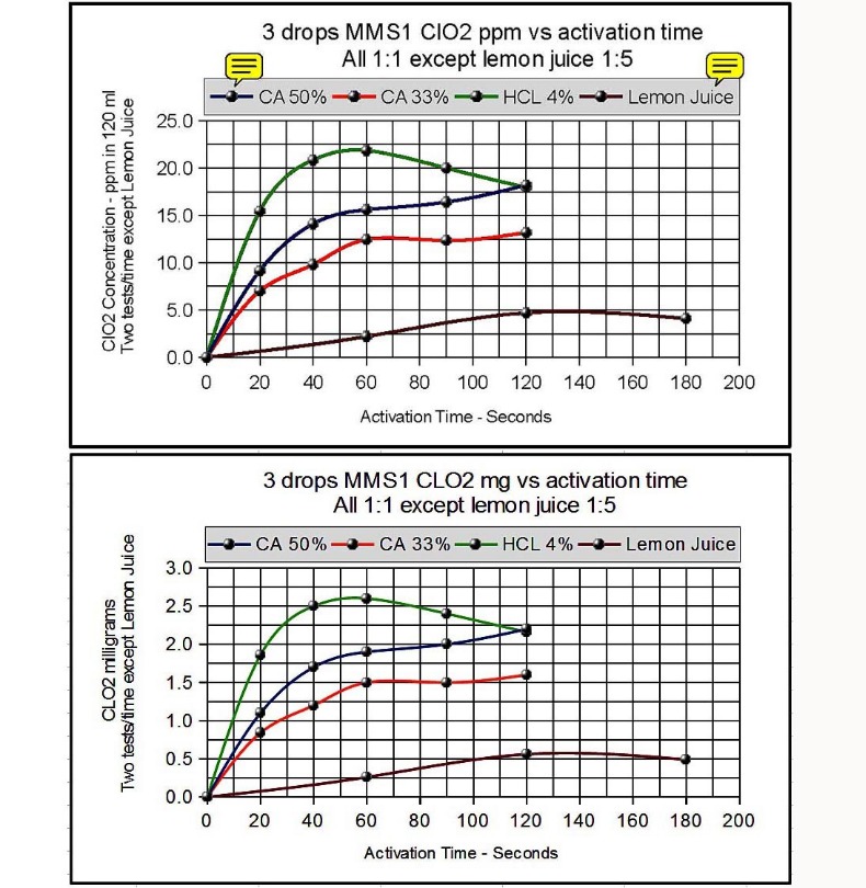 To get a little more technical, the maximum amount of CLO2 in 3 drops of MMS is 20.1 mg of CLO2. Since we have measured 2.3 mg, that means a 3 drop dose of MMS1 activated (externally - outside a stomach) with 4% HCL for 30 seconds releases about 11% of the available 20.1 mg of CLO2. The other 89% should be released in a stomach with normal amounts of gastric acids.