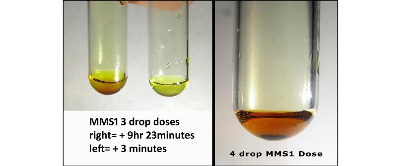 From Jim's book => Amber Color: When citric or hydrochloric acid is added to sodium chlorite (in the percentages mentioned in this book), after 30 seconds the drops should turn amber in color. In this book when we say amber, we are referring to a brown color. This can be anywhere from light to dark brown, but not yellow. The amber color of MMS activated drops before adding water, is much like the color of a glass amber bottle (such as is used for essential oils, various medicinal potions, or for beer bottles), when held up to the light.