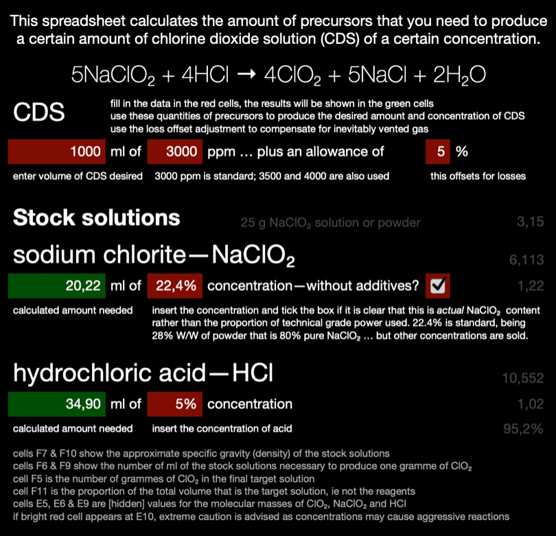 If the concentration of the stock is set at greater than 50%, the equations alter to calculate grammes rather than ml on the assumption that you are using undissolved powder rather than a solution. (The maximum concentration of NaClO₂ in water is dependent upon temperature of course but is around 28%.)
