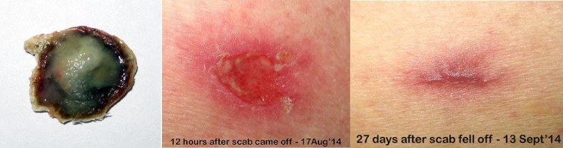 i used inactivated MMS plus DMSO and it healed nicely, the scab fell off and then after a few months it recurred.