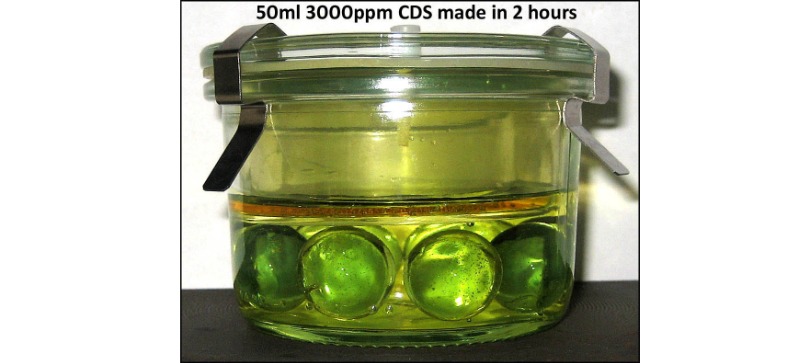 This small container produced 50ml of 3000ppm CDS in two hours at 62% efficiency. That is enough CDS for one day for most people. If used up in one day, it would not need to kept in a fridge. If you look closely, you will see a white silicone plug inserted into a hole drilled in the glass lid so CDS can be taken out of the container without losing CLO2 gas. Once CDS is made, the lid does not need to be removed. You could use a syringe and needle to take out all the CDS and transfer it to a small-mouth bottle if desired.