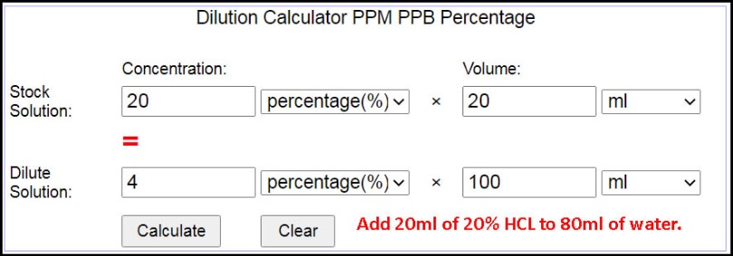 if I want to make 4% acid from 20% HCl, I make 20% by adding 4 equal parts of distilled water. So 1 part acid 20% and 4 parts water so I get 4% acid ??