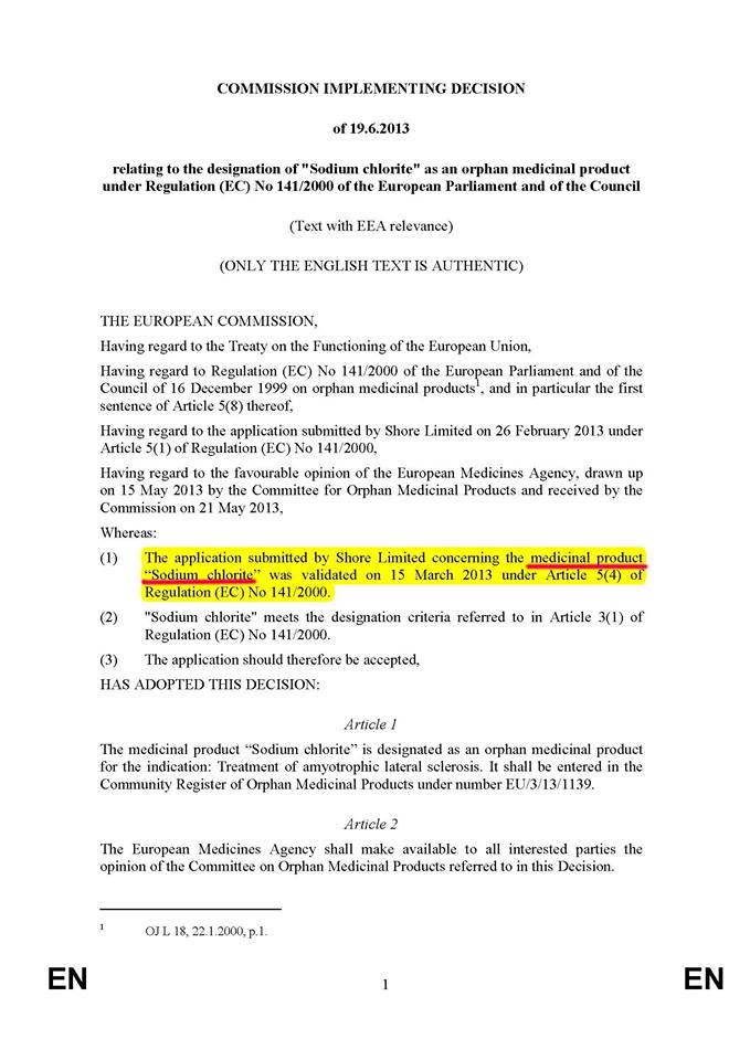 I would think bottles of Water Purification Drops Part-A could also state that it is a Medicinal Product for the "treatment of ALS" as per Regulation (EC) Number 141/2000 of the European Parliament and of the Council, 19.6.2013. Note that the form of SC is not mentioned, so it could be SC flakes or 22.4% SC liquid solution.
