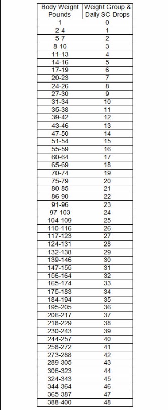 Here is a simplified dosing chart if you are following the www.facebook.com/groups/SCSINFO/ Non-Acidified Sodium Chlorite Protocol. There are 48 weight groups which also happen to be the daily amounts of SC drops as well.