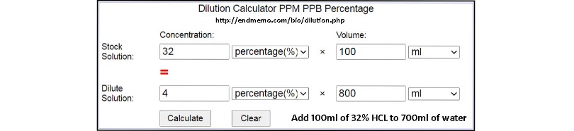 Also is my calculation below correct for making 4% HCl from 100 ml 32% HCl.