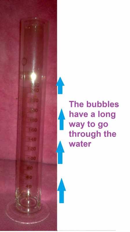 The taller the container is, the more time the bubbles will go through water and more time for the CD to go into the water before it is being released into the air.