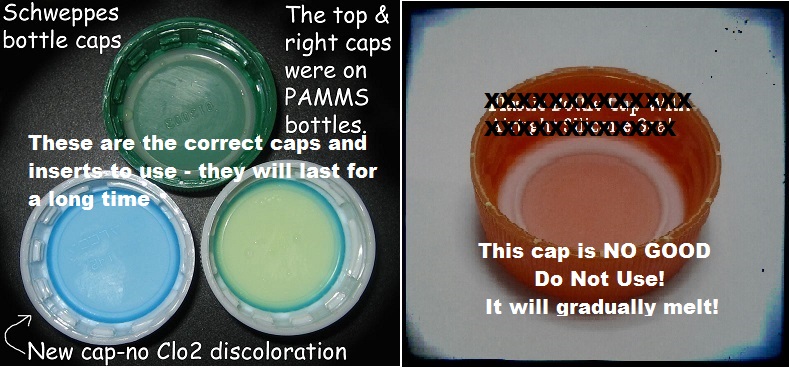 DO NOT use the caps that have the silicon rubber inserts. They gradually melt in the presence of CLO2 and then will drip into your CDH solution if they're on long enough (like 3 to 6 months). They even smell bad and also they are difficult to unscrew because they basically become sticky as the silicon melts. The best caps have a fairly stiff plastic disk type of seal insert in the caps. They are usually clear, opaque or slightly blue and they are not rubbery feeling at all. These seem to last at least a year, maybe longer. CLO2 probably knows better than I do how long they last.