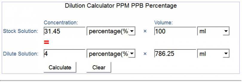 My chemisty is pathetic. What would the ratio of ml of HCL 31.45% to ml of distilled water placed in the fume container to produce ~ 4% HCL. A one step process would be wonderful.